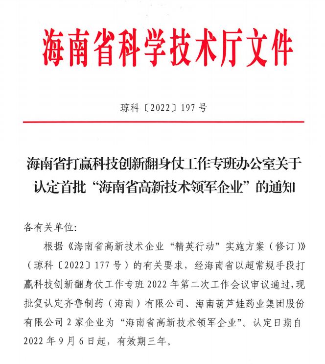 近日,海南省科学技术厅发布的《海南省打赢科技创新翻身仗工作专班办公室关于认定首批“海南省高新技术领军企业”的通知》中显示,批复认定海南mg冰球突破药业集团股份有限公司等2家企业为“海南省高新技术领军企业”。认定日期自2022年9月6日起,有效期三年。