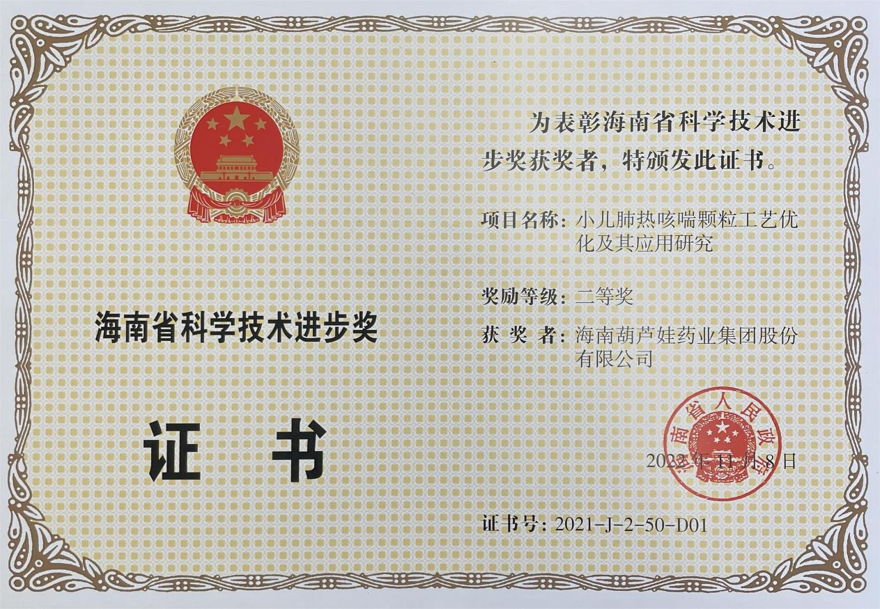 为此,小儿肺热咳喘颗粒的制备方法获得了第二十一届中国专利优秀奖(2019年),专利申请号:ZL201010134951,此次作为专利技术的应用,获得了2021年度海南省科学技术进步奖二等奖。在此之前,mg冰球突破牌小儿肺热咳喘颗粒还多次被授予“临床价值中成药品牌”、“中国连锁药店最具合作价值单品”,荣登“中国医药品牌榜”。